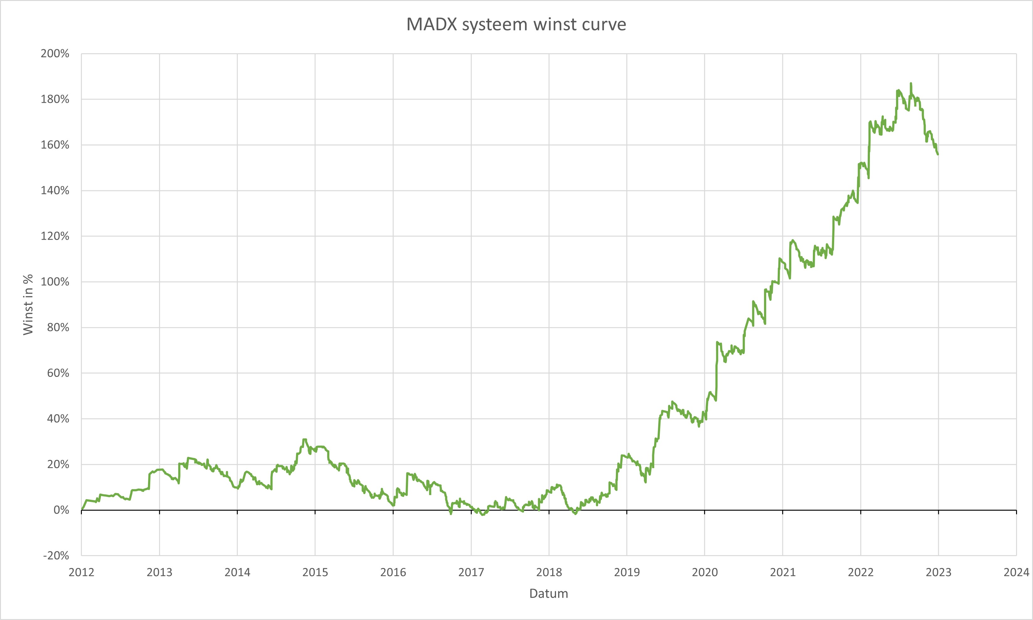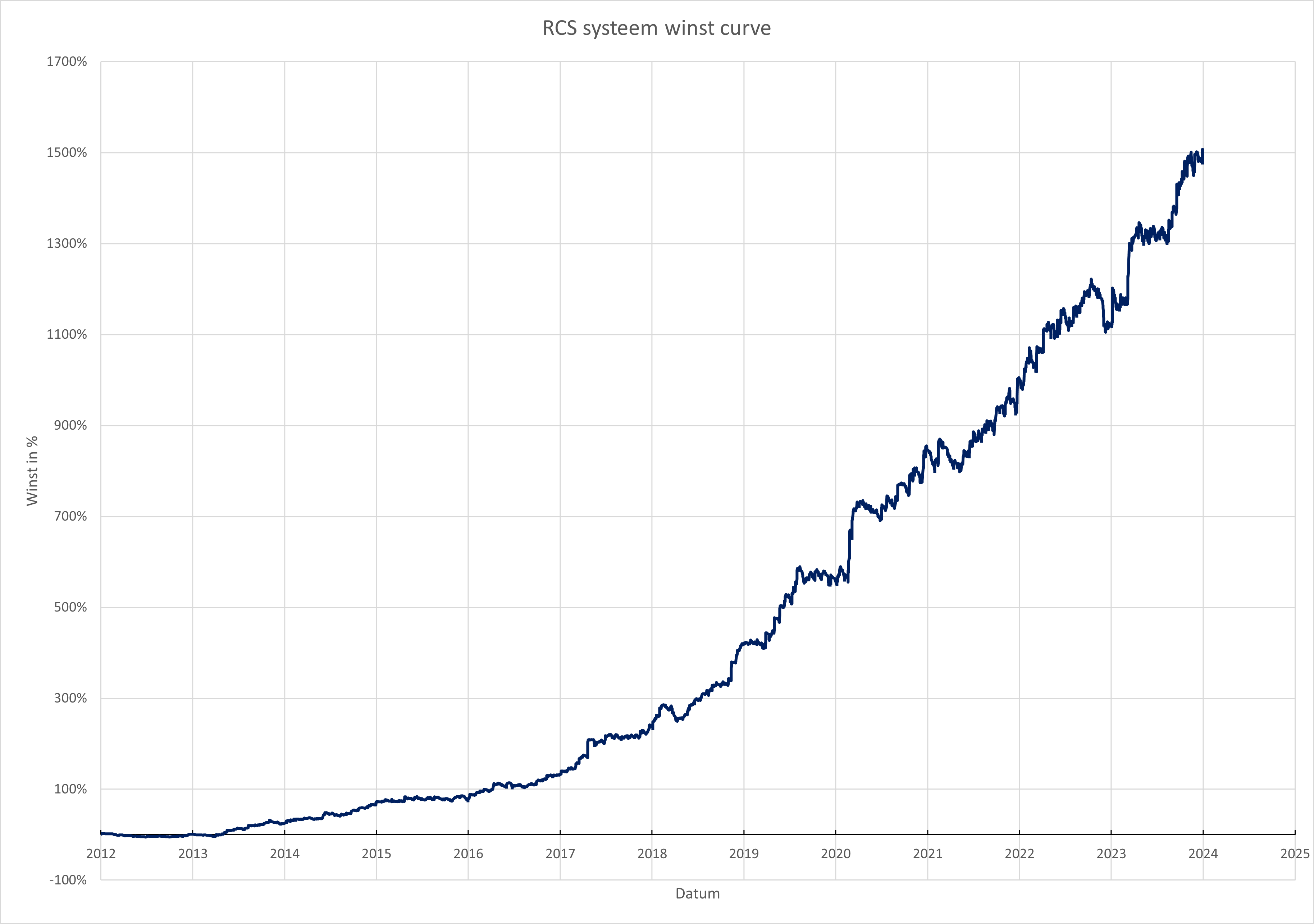 Rendement op investering over 12 jaar = 1507,55% | CAGR% = 22,58% | Maximale verlies = -9,58%