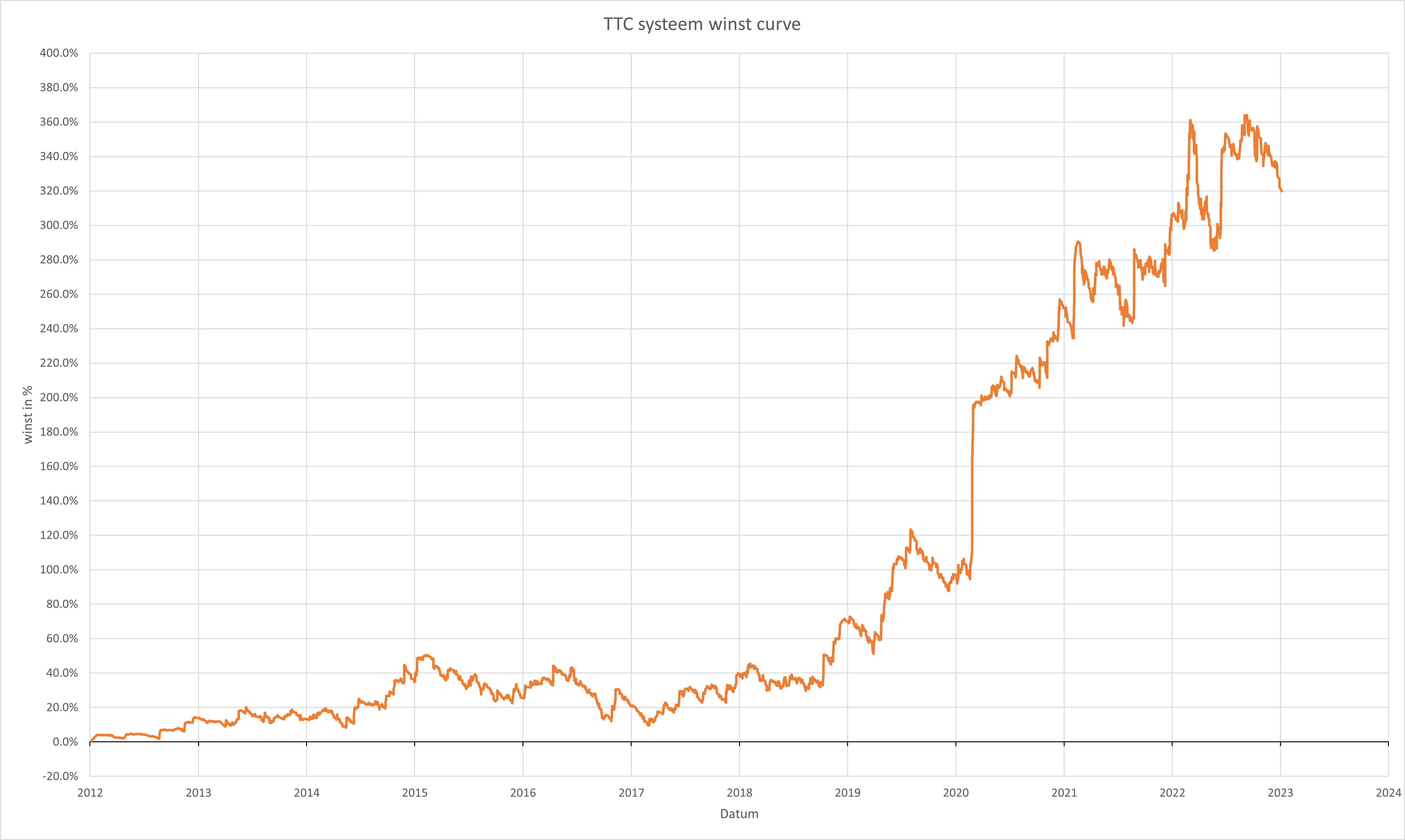 Rendement op investering over 11 jaar = 319,90% | CAGR% = 12,21% | Maximale verlies = -27,25%